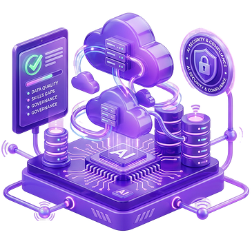 This gives leaders a realistic view of what is ready now, what gaps need to be addressed, and what technical and operating improvements should come first. The work helps reduce risk early by identifying issues across compliance, security, process discipline, talent, and infrastructure before implementation begins.