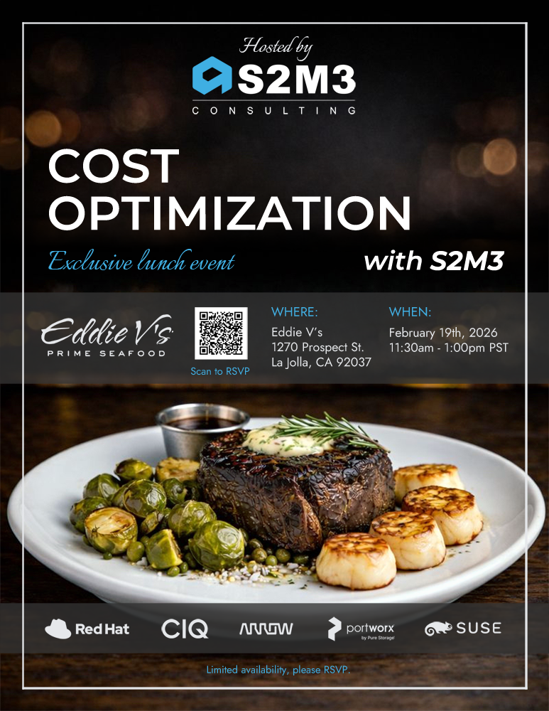 Join us for an exclusive executive lunch event at Eddie V’s in La Jolla on February 19, 2026 at 11:30 AM PST, hosted by S2M3 Consulting sponsored by CIQ and in partnership with Red Hat, SUSE, Arrow, Portworx by Pure Storage, and CIQ.